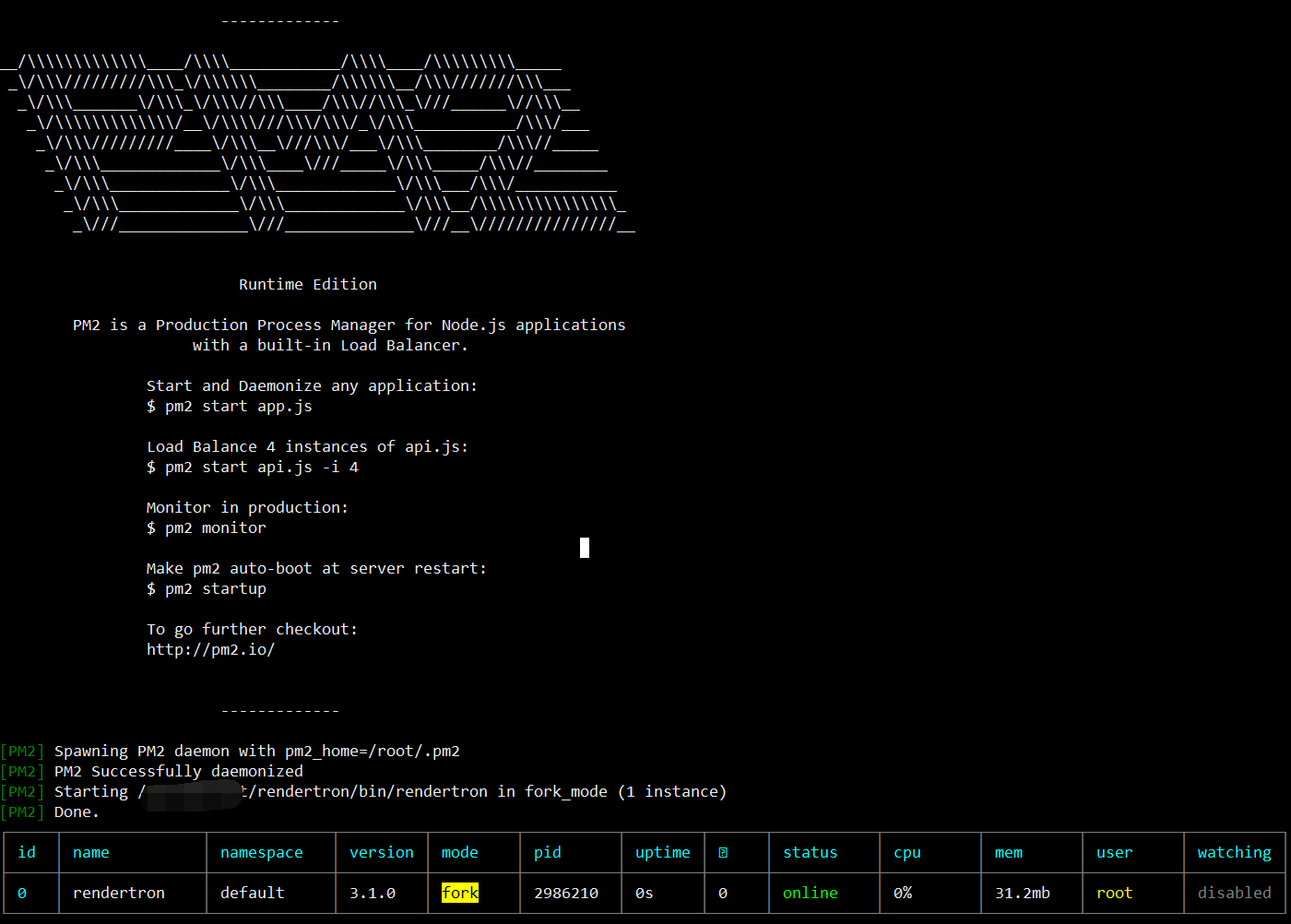 │ 1 │ rendertron │ default │ 3.1.0 │ cluster │ 2754558 │ 25h │ 1 │ online │ 0% │ 66.8mb │ root │ disabled │