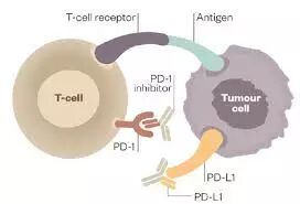 而现在的一些免疫检查点克制剂能够阻断PD-1与PD-L1之间的交流。它们都是人源化的单克隆抗体,能够与PD-1或者PD-L1联合。这能够让T细胞表面的PD-1无奈与肿瘤细胞的PD-L1联合,让T细胞不至于被麻木,也能够直接与肿瘤细胞排泄的PD-L1联合,不让它们靠近T细胞的PD-1受体。总之,这类药物阻断了肿瘤细胞对T细胞的“欺骗”,让T细胞能够得以保持活性,对肿瘤细胞产生杀伤。