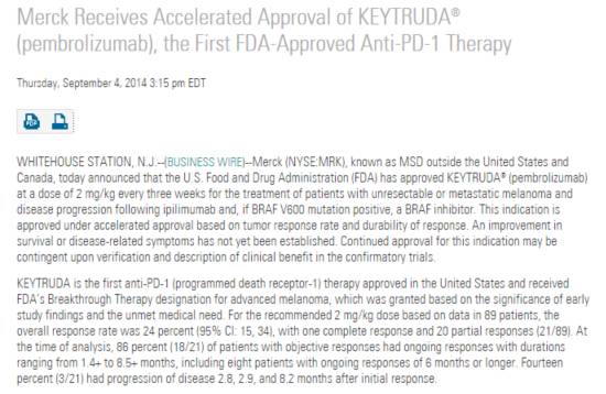值得一提的是,魏则西网友拜托香港友人带回来,产生疗效的“靶向药”Keytruda,正是最早被同意的PD-1抗体药物之一。这是一种货真价实的肿瘤免疫疗法。它在2014年被美国FDA同意,成为FDA同意的首个PD-1抗体药物。而在此之前,日本也同意了一种PD-1抗体药物Nivolumab。除了这两种药物外,更多与PD-1和PD-L1有关的药物也正在开发之中。